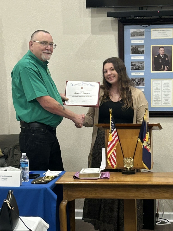From Left to Right:  Eddie Fontaine, Richard Hoibraten, Connie Totman, Bernie Fontaine, Keith Hunter, Rick Hack, Chuck Honaker, Ed Crenshaw, Skip Fischbach, Bob Spaulding. Not Pictured - Bill Honaker Patriots Night Of Lights was held on 9/11/21 at Meeks Park. Ms. Hailey Watkins was nominated at the Post level for Teacher of the Year. Officer Lockwood of the Union County School Resource Police was nominated at the Post level for Public Servant of the Year. Rebekah Pickelsimer from the Mountain Area Christian Academy was nominated at the Post level for the Patriots Pen scholarship.  Joshua Munoz from Mountain Area Christian Academy was nominated at Post level for the Voice Of Democracy scholarship. On March 3, 2022 Member's of the VFW Post 7394 participated in Mr. Justin Byers was recognized as the post level selection for the  Smart/Maher VFW National Citizenship Education Teacher program. Mr. Byers is a Marine veteran and currently teaches at the Union County High School. Sr. Vice Commander, David Miller was selected as the 23-24 Post Member Of The Year. Lt. Millie Baxter of Union 911 and Lt. David Ueltzen of the Union County Fire Department, station 4 were recognized as the Public Servant Of The Year. Kyra Mckechnie was recognized as the 230-24 post level Voice Of Democracy Award winner for Sr. Vice Commander David Miller and Trustee 2nd Year Herman Clowney participated in the Hope House annual fundraiser. Teacher Of The Year - Mr. William Stafford Voice Of Democracy Winner: Reagan Huneycutt.